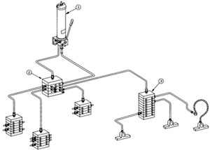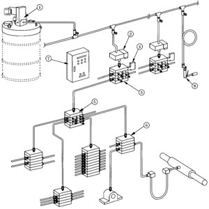 5、單泵多區(qū)域給油方式 這種給油方式特別適合于長達數(shù)百米的軋制機組上使用。 由中央泵把油脂送入F50mm左右的主管,再由主管送往各區(qū)域的分管,分管上裝有電磁閥,通過電磁閥的開與閉,可以間斷地將潤滑脂送到各區(qū)域的分配器,再向潤滑點給脂。 使用這種系統(tǒng),可以對數(shù)千個軸承都能用一臺中央泵自動地進行給脂