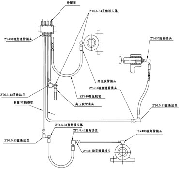 配管例③(分配器→軸承配管要領-固定部位) 潤滑點可以有固定、移動、旋轉三種不同類型,其配管方法各異。對于固定不動的部件,一般工作場合的配管主要使用銅管,特殊場合則使用不銹鋼管,分配器出口側采用端直通管接頭,軸承側應使用直角管接頭或端直通管接頭。 |