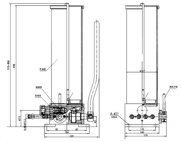 | 四、安裝及調(diào)試 安裝: 1、SRB-J7-4/4型手動潤滑泵應安裝在以通風、透光的室內(nèi),露天安裝使用必須加設防護罩,同時必須保證手柄能自由擺動。油位指示桿上方應有足夠的空間,以便油位指示桿能伸出,還能方便地向貯油器中加油潤滑脂。 2、SRB-J7-4/4型手動潤滑泵必須直立安裝,并用四只M10×30螺栓緊固。 3、泵與主油管及系統(tǒng)中配管的連接處應緊密,不得有滲漏現(xiàn)象,不允許使用麻絲或鉛油等輔助材料。 調(diào)試: 1、加潤滑脂必須從加油過濾器裝置中用專用的加油 泵注入,嚴禁揭蓋加油,防止油中油臟物或空氣混合,致使泵不能正常工作。加入潤滑脂的針入度為不低于265(25℃,150g)1/10mm。 2、起動前,應向壓力表接頭內(nèi)注50#機械油,以便干油進入壓力表而影響顯示精度。 3、當手柄來回扳動,這時潤滑脂將被入主油管中,系統(tǒng)中的給油器全部工作后壓力上升,應停止供油,同時要及時換向,以便消除管路中油壓力。 五、使用及注意事項 使用: 1 潤滑脂必須從加油口用專用加油泵向貯油器中加入,并觀察油位指示桿上的刻度線,即可知道加滿與否。 2、連接供油管,采用GB9065.3膠管接頭8I與系統(tǒng)中管路連接。 3、應保持潤滑泵的清潔,防止酸、堿等物的腐蝕。 注意事項: 1、加油過濾器的濾芯應定期清洗。 2、柱塞泵的活塞與泵體內(nèi)孔的配合間隙極小,必須嚴格控制臟物進入,以免影響正常工作。 3、貯油桶內(nèi)油位下降至下位時應及時加注,不得再扳動手柄以便空氣進入管路影響潤滑效果。 六、故障原因及排除 潤滑泵使用不當時,會出現(xiàn)壓力不上升或壓力急劇上升的現(xiàn)象。 1、壓力不上升,主要是由于泵內(nèi)含有空氣或泵內(nèi)單向閥失靈,以及配管連接處有泄漏造成,查明原因后消除,即可恢復正常。 2、壓力急劇上升凡要是由于管道堵塞或分配器動作不良以及換向閥沒有換向造成,查明原因后排除之,即可正常工作。 | |||||||||||||