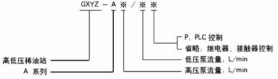 | 如采用A系列,高壓流量為2.5L/min;高壓壓力為31.5MPa,低壓供油壓力為0.4MPa;而低壓供油量為40L/min的高(低)壓稀油站,采用PLC控制的則按如下方法標注:GXYZ-A2.5/40.P |