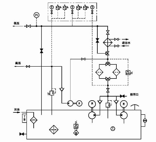 本產品主要由油箱(其內裝有磁網過濾器)、低壓油泵裝置、高壓油泵裝置、雙筒網片式過濾器、手動高壓油泵、冷卻器、管道、閥門、儀表盤及電控柜等組成。 在主機啟動前,先啟動低壓泵,當低壓供油壓力正常后,啟動吸口聯于低壓管道上的高壓油泵,高壓油經高壓單向閥送往靜壓軸承,當高壓達一定值使主軸浮起時,主機就可啟動、低速運行或停止;主機轉速正常后,就可以停止高壓泵(低速運行除外),但低壓油泵必須正常供油;低壓油泵從油箱吸油后經單向閥,雙筒網式過濾器、冷卻器后亦往靜壓軸承,維持主機正常供油;若主機停止后,尚要定時由高壓泵和低壓泵供油,則由時間繼電器進行控制向潤滑點斷續供油。 高、低壓力的具體數值分別由系統中的低壓安全閥和高壓溢流閥控制。 主機正常運行時,低壓泵一臺工作,一臺備用,若系統壓力下降到某值時,備用泵啟動投入運行,達到正常壓力時備用泵停止。若備用泵啟動后壓力仍下降到某一更低值時,就應發出報警訊號,考慮主機停車。 高壓柱塞泵有故障時,可由備用手動油泵供油。 過濾器置于冷卻器前,使粘度較小的油先通過過濾器,以提高過濾效果,過濾器一筒工作,一筒備用,由手動切換閥控制。 油箱油位過低過高時均由油位訊號器發訊,人工加油或停止加油。 回油油箱內設有磁網過濾器,能同時對油進行過濾和吸附油中鐵質微粒。 稀油站成套供貨時配有儀表和電控箱,以顯示運行參數和實現稀油站自控、手控或報警。 油箱上裝有電接點雙金屬溫度計,油溫低時發出信號,人工接通電加熱器,達到設定溫度時,自動切斷電加熱器。 供油口裝有電接點壓力式溫度計,根據供油溫度,調最高最低二個界限,用以控制冷卻器的使用與否。 |