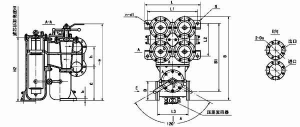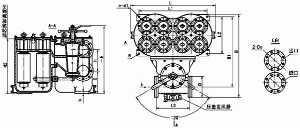 | 法蘭標準:GB573-65(可根據需要確定):DN100、150-3 組濾芯組件 DN200-4 組濾芯組件;壓差發訊器為選配件。 |